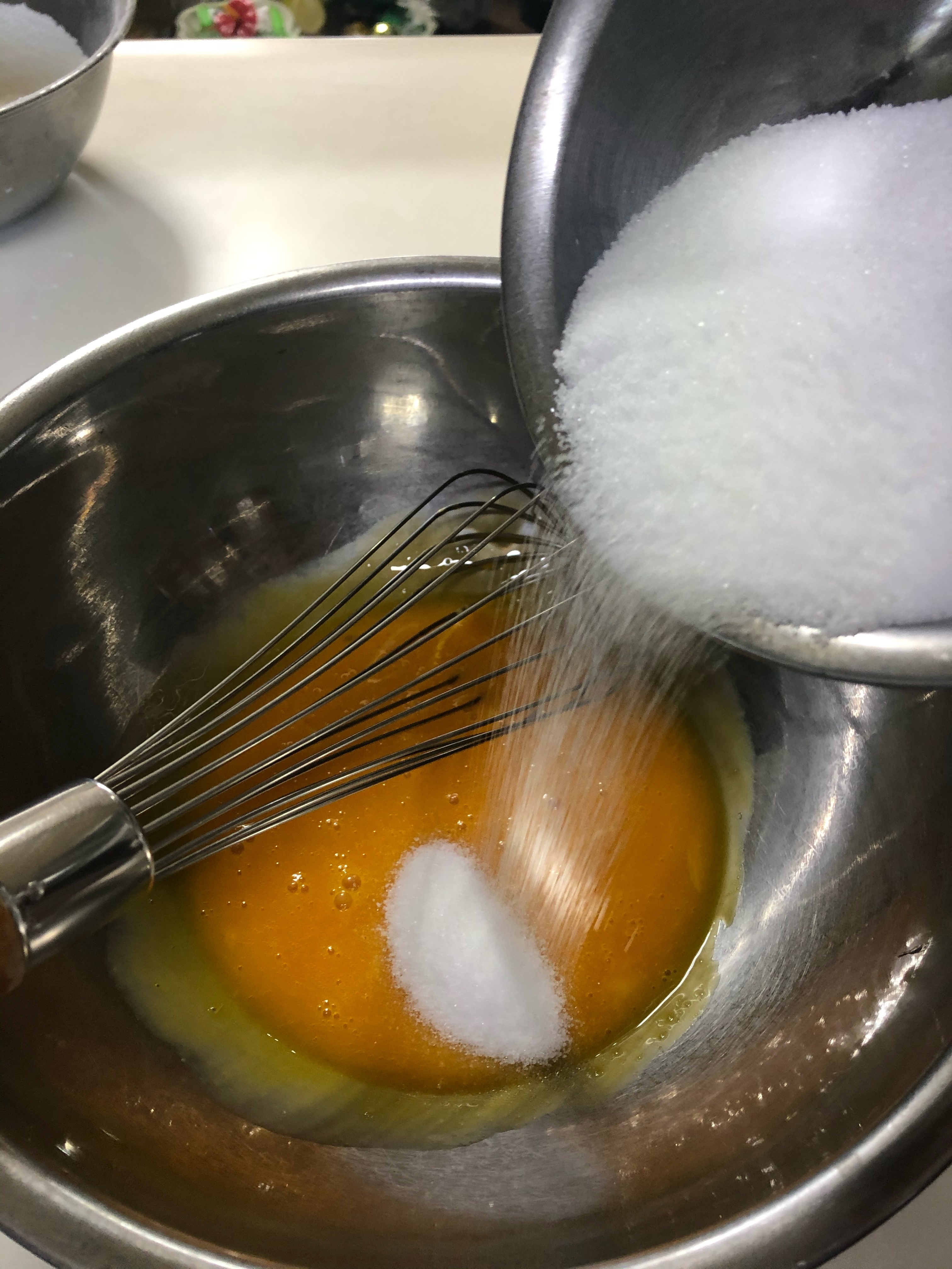 シフォンケーキだけはず~っと同じレシピです。 何度も何度も・・・というか1週間に1回は作っているかも。 それでは基本のシフォンケーキのレシピです。 (17cm型使用) 卵 4個 砂糖 40g~80g※1 油 40cc 牛乳(水) 70cc 薄力粉 73g~76g※2 ベーキングパウダー 0g~3g※3 塩 ひとつまみ基本のシフォンケーキ 基本レシピのポイントをおさえながら、シフォンケーキ作り成功のコツを分かりやすくご紹介します。 また、成功の鍵となる、メレンゲをきれいに泡立てるコツもお教えします。 初心者さんから、なかなか納得の仕上がりにならないとお悩みの方まで、これを読んでシフォンケーキ作りをマスターしましょう レシピ詳細を見るハンドミキサーを持ちあげたときに、ピンと角がついたメレンゲを持ちあげられるくらいになったら、1/3量の砂糖を加え、再び高速で泡立てます。 砂糖を加えた直後は少しゆるみます。 しっかり泡立てができ、表面にツヤがでたところで、残りの1/3量を加え、しっかりと安定感のあるメレンゲを作ります。 再び、角がたち、ツヤが出てきたら、ハンドミキサーを